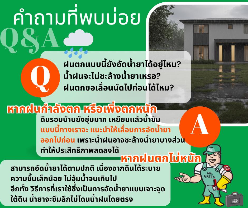 กรณีฝนตกไม่หนัก หรือหยุดตกไปแล้วสักพัก ก็สามารถอัดน้ำยาได้ตามปกติ เนื่องจากดินได้ระบายความชื้นเล็กน้อย ไม่อุ้มน้ำจนเกินไป อีกทั้งวิธีการที่เราใช้ซึ่งเป็นการอัดน้ำยาแบบเจาะจุดใต้ดิน น้ำยาจะซึมลึกไม่โดนน้ำฝนโดยตรง
